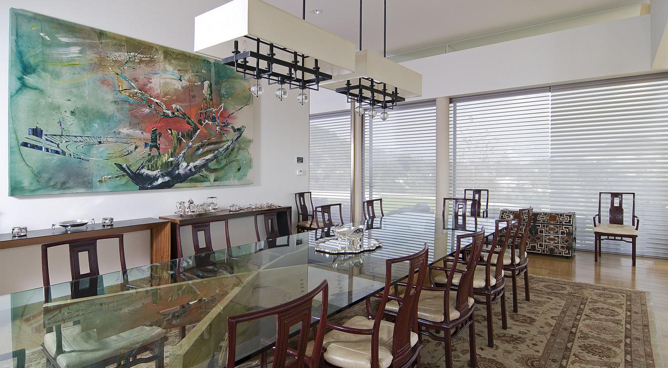 "Para este proyecto se usó una Cortina Silhouette®, perfecta para disminuir la entrada de luz, proteger los muebles y darle un toque de elegancia al ambiente. Los grandes ventanales hacen que las cortinas ocupen un área bastante amplia, razón por la cual constituyen un elemento fundamental del diseño: en éste también sobresale el magnífico contraste entre la paleta de colores y las texturas de madera y vidrio presentes en el mobiliario".