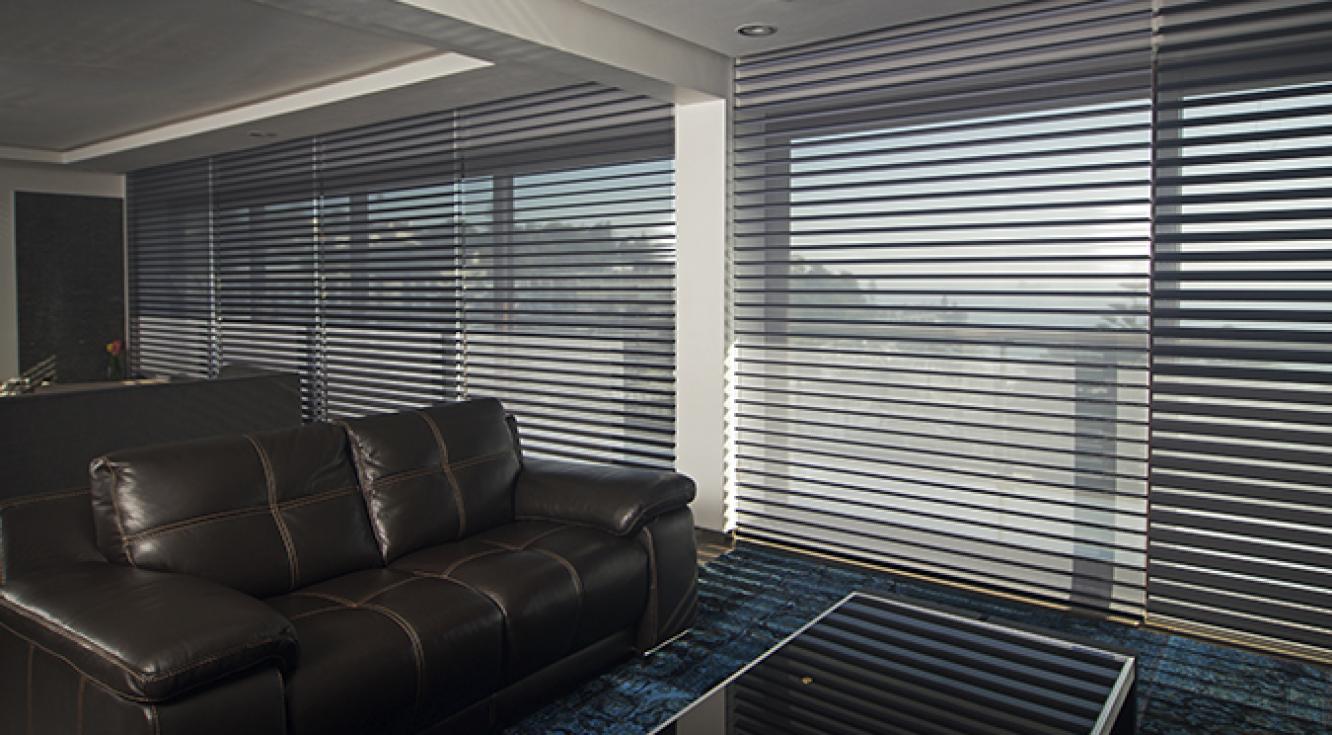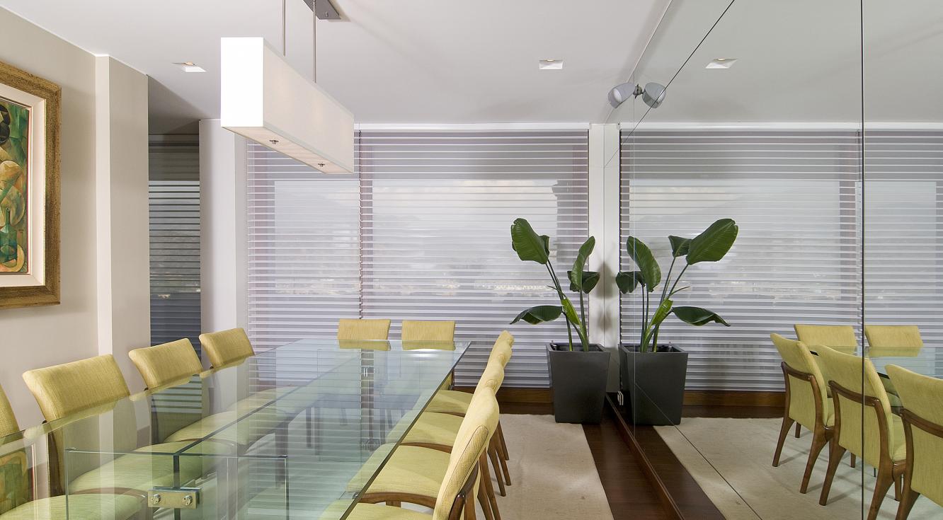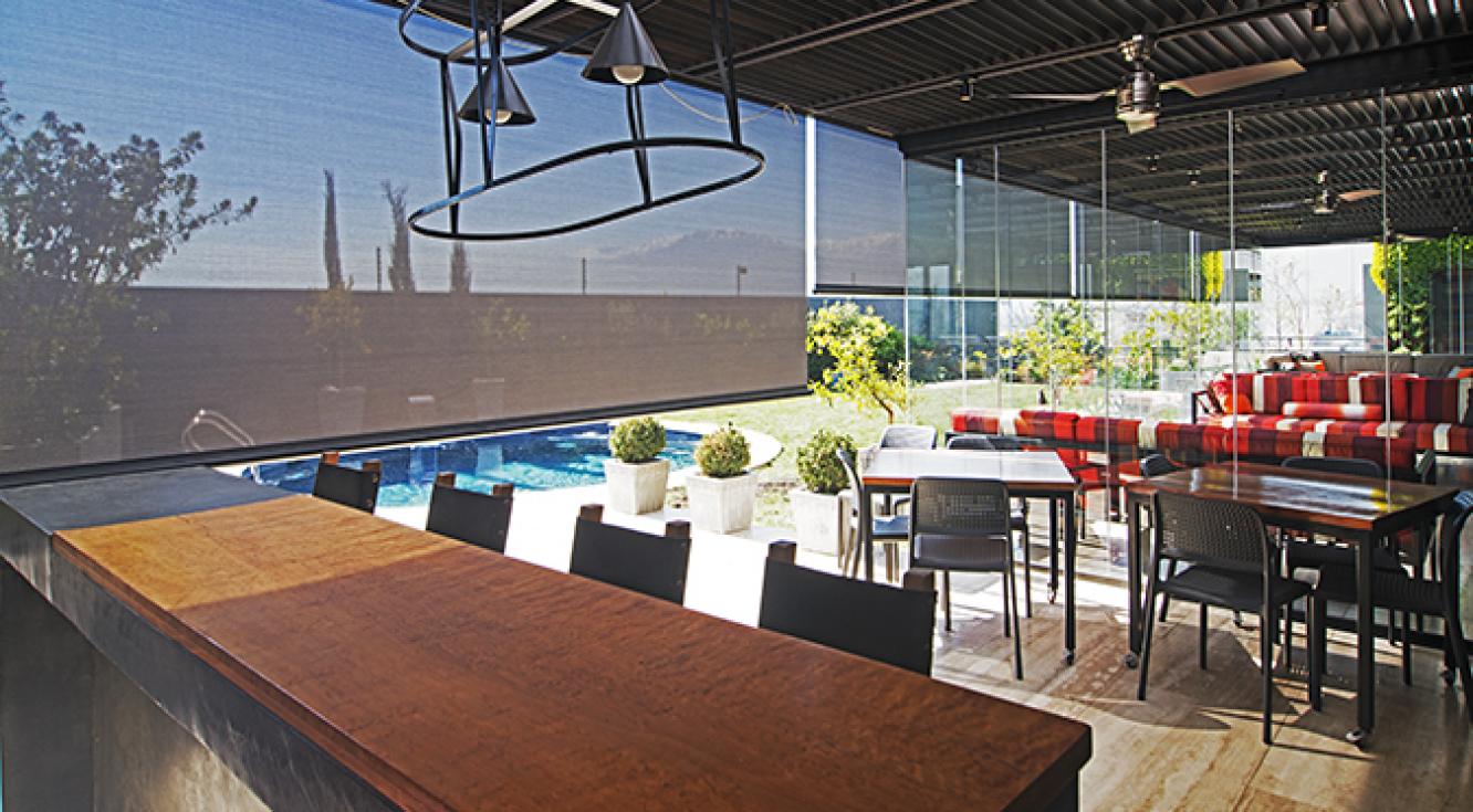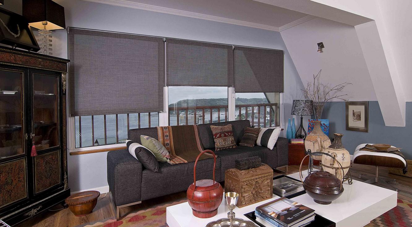 "Para nuestro proyecto usamos cortinas de madera negra gruesas, acordes con la decoración de este salón. La idea era crear un espacio sobrio y acogedor, ideal para un soltero: los colores neutros se verían resaltados por las texturas del cuero y de madera. La Persiana Country Woods® jugó un papel importante en este diseño, pues, además de contribuir con el color, permitió controlar la cantidad de luz que entraba a la habitación".
