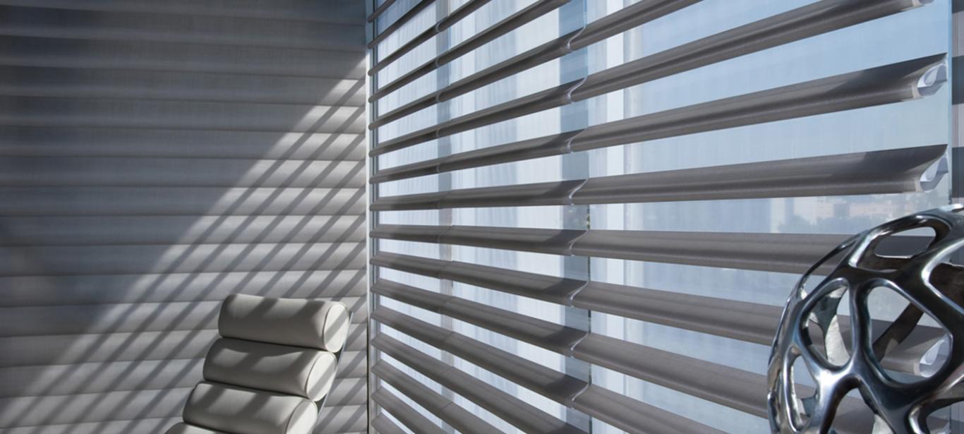 La Cortina Pirouette® combina lo mejor de las telas tradicionales con control de luz, protección UV, reducción de altos contrastes y privacidad. Posee un exclusivo diseño de láminas horizontales en una capa sheer que parecen flotar sobre la ventana, ofreciendo un look atractivo y lujoso que otorga claridad y transparencia.